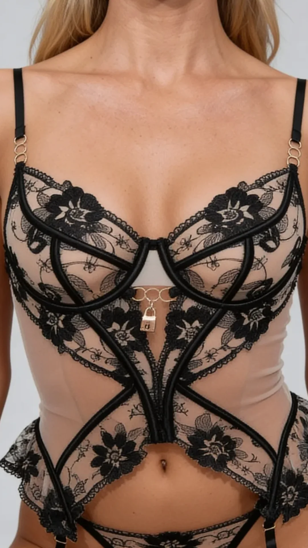 Meet Aurora—the couture set that says it for you. Black floral embroidery on nude tulle meets sculptural lines and gleaming gold hardware for a breathtaking finish. Two removable padlocks—front and back—turn elegance into power. Supportive, sensual, unforgettable.